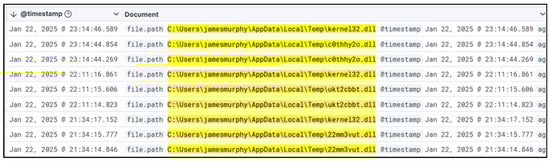 The detection logic was validated through an atomic test, where a benign DLL file was intentionally copied into the \\AppData\\Local\\Temp directory and executed from there. This controlled action mimics the behavior of a DLL running from a temporary folder, a pattern commonly linked to malicious activity while ensuring the test remains safe for the environment. However, in some cases, this could be a legitimate file dropped during an application installation; nonetheless, such instances are mostly associated with malware or malicious executions. To address this, the authors created a query as shown in Table 4 to identify the DLL written to the AppData folder that matches the observed WhisperGate DLL naming.