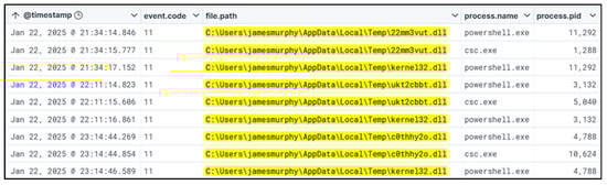 To find the unique file names dropped in the AppData folder, the ‘file name’ visualization reveals four DLLs involved in command line arguments. When filtering the process command line field for the four identified DLL names, the search in Figure 6 returned 16 matches. Each match corresponded to Sysmon Event ID 1 (Process Creation), which aligns with Windows Event ID 4688 in native Windows Security Logs. Both events indicate that a new process was created, confirming that these DLLs were executed on the system.