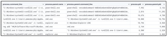 The SIEM dashboard was updated to include additional fields—Process Command Line, Process Parent Command Line, Process Name, Process ID, and Parent Process ID—to provide deeper context during analysis. Figure 7 displays 8 hits with ‘PowerShell.exe’ as the parent process and ‘Rundll32.exe’ as the child process. This shows ‘Rundll32’ is calling the same DLL found in the initial search query. The parent command line contains a Base64-encoded string, which is used to obscure the actual instructions being executed.