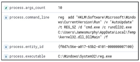 The most straightforward way to simulate the expected behavior is to run the command and check its output as ‘reg ADD HKLM\SOFTWARE\\Microsoft\Windows\CurrentVersion\Run/V “Test Entry”/t REG_SZ/F/D “C:\Windows\System32\cmd.exe”’, which might succeed on occasion. However, the author designed the query logic for detecting these attacks using the Elasticsearch SIEM as displayed in Table 6. This threat hunt logic identifies when an entry is added into the ‘run keys’ in the Registry, signalling that an adversary is potentially trying to achieve persistence. This technique is intended to configure the device to execute a program upon startup or even potentially gain escalated privileges. To validate this activity, the associated logs should be reviewed to confirm that an entry was added to the Version\Run registry key.