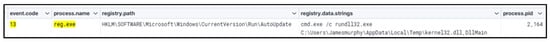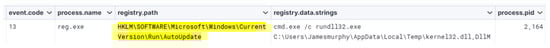 Upon reviewing additional logs, this DLL is mentioned in another process create event for modifying registry keys, calling ‘reg.exe’. Figure 8 presents the process command line, which displays Process ID ‘2164’ changing the current version run registry key to add key name ‘AutoUpdate’. This exhibits similar behavior to other processes that create events with ‘RunDll32.dll’, which calls ‘Kernel32.dll’. This comes across as someone trying to gain persistence.