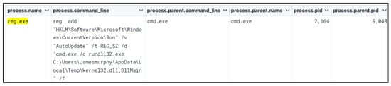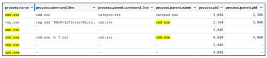 The research methodology in this study focuses on developing and implementing an Elasticsearch-based [] Security Information and Event Management (SIEM) system. The authors created this for threat hunting to detect registry modifications that enable privilege escalation on compromised machines. The first phase of the threat hunting process centered on identifying Boot Logon Autorun mechanisms, especially targeting the AutoStart Extension Point (ASEP) registry keys []. These keys are important because they control the execution of specific processes when a user logs in, making them potential targets for malicious activities. By carefully analyzing these registry entries, the research aimed to find unauthorized changes that could signal an ongoing attack or a previously compromised system.