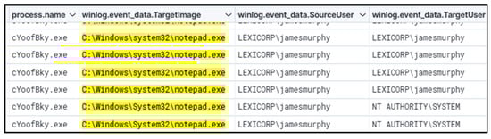 Removing Event Code ‘4663’ and visualizing the remaining codes, which reveals 23 hits. In terms of Windows Sysmon monitoring, Event Code ‘1’ (process create). ‘11’ (file creation), ‘13’ (Registry Key modification), and others, including ‘10’, refers to a ‘process access event. This means that a process has attempted to open another process on the system, often to read or write to its memory space. Adding the Event Code ‘10’ as a filter, Figure 11 illustrates four hits with ‘Rundll32.exe’ being the source as well as the target image. This indicates no changes were made, and thus this is not suspicious.