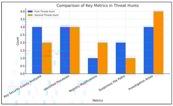 Table 10 presents a quantitative breakdown of key elements identified during the two threat hunts. It highlights the number of analyzed events, identified processes, suspicious registry modifications, detected malicious file paths, and recommended investigation areas. These numerical insights help in understanding the scale and complexity of each threat hunt.