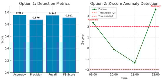 The second graph, on the right, illustrates the application of statistical anomaly detection using Z-score analysis. This time-series plot tracks the Z-scores of registry modification events over four different time intervals. Spikes that exceed a threshold of ±2 are marked in red as anomalies, aligning with confirmed instances of privilege escalation attempts. For example, the spikes at 09:00 and 12:00 with Z-scores of 2.37 and 3.62, respectively, indicate statistically significant deviations from normal system behavior, corresponding to suspicious registry activity. This graph highlights the effectiveness of statistical models in identifying outliers in event frequency, which may signal zero-day threats or stealthy persistence mechanisms. Together, these graphs validate the precision and depth of the threat detection methodology.