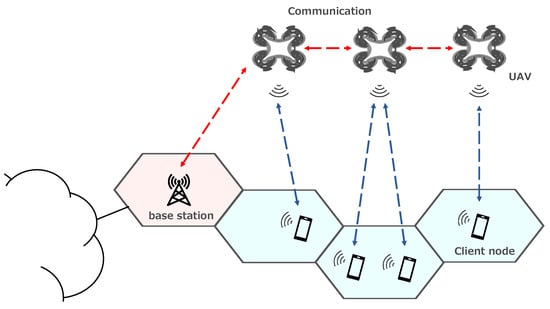 - The initial deployment is determined as follows. The first UAV is placed in the cell adjacent to the base station that contains the largest number of client nodes. Subsequently, each UAV is placed in the adjacent cell of either the base station or already deployed UAVs that has the largest number of client nodes.