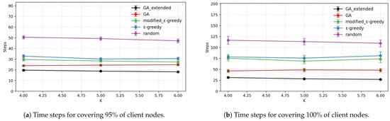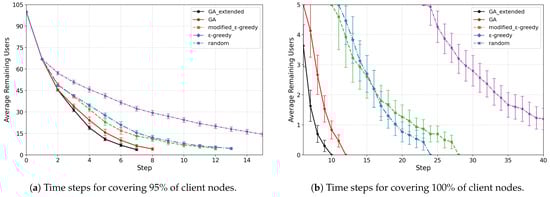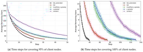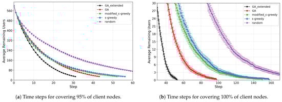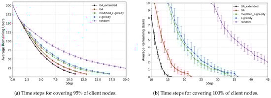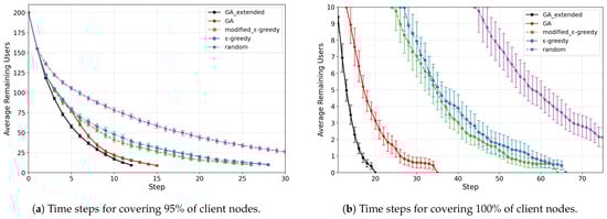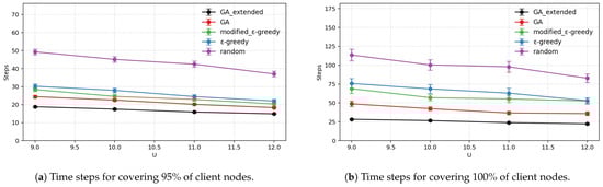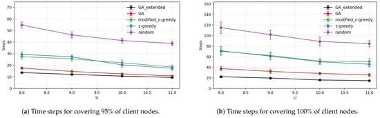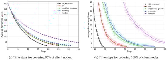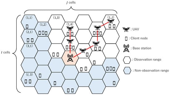 - If , UAV u selects the cell with the highest number of client nodes among cells that are both within its observation range and movement range, while meeting the connectivity constraint. Note that if the number of client nodes within the observation range is 0, a cell is randomly selected from the UAV’s movement range.