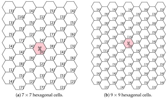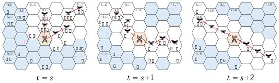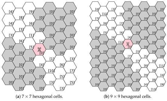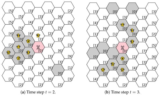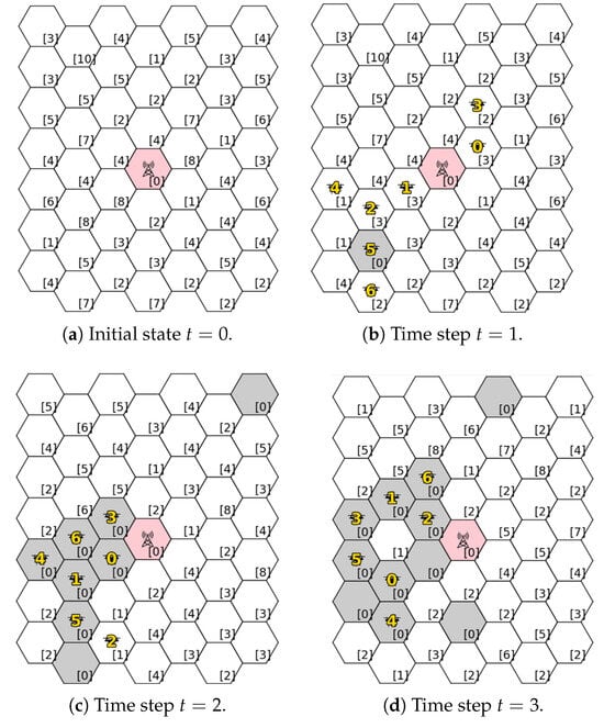 - If , UAV u selects the farthest reachable cell from its current position while maintaining the connectivity constraint. In this case, cells outside the observation range are also considered for selection. If there are multiple candidates, a cell is randomly selected.