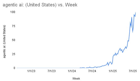According to Google Trends, interest in “agentic AI” remained minimal for years, then spiked beginning in April 2024, reaching its peak in July 2025. A value of 100 represents the term’s highest recorded popularity, as shown in Figure 2. This sharp rise reflects a global shift toward building AI that can plan, act, and adapt with minimal human guidance.