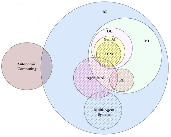 Figure 3 shows the relationships between different areas of artificial intelligence. At the broadest level, everything falls under AI, with Machine Learning (ML) as a major subset. Inside ML, deep learning (DL), generative AI (Gen AI), and LLMs are shown as nested areas, reflecting their strong connection. Reinforcement learning (RL) also sits within ML but separately. Agentic AI overlaps with these technologies, as it draws from both LLMs and RL, while also sharing ideas with MAS [77,78]. Autonomic computing is placed outside, showing that it is related but not fully inside the AI family; it focuses on self-managing systems that can configure, heal, optimize, and protect themselves, which overlaps with AI but also extends into broader fields like distributed systems and IT infrastructure.