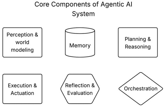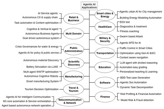 What makes agentic AI stand out is its combination of key abilities in one system. These include strategic planning, memory that preserves context over time, using external tools to extend capabilities, and collaborating with other agents [38,39,40]. By combining foundation models with planners, knowledge bases, sensors, actuators, and feedback mechanisms, these systems can understand complex environments, adjust strategies in real time, and achieve their goals independently [37,41,42]. However, in the real world, autonomy can be defined as a system’s capacity to establish sub-goals, finish tasks without human involvement, and adjust to unexpected events [22]. Even though existing frameworks show some autonomy, they are frequently still constrained by problems like reliance on human-defined goals, vulnerability to mistakes in long-term planning, and difficulties with accountability. This makes them highly valuable in areas like scientific research, industrial automation, and compliance management [43,44,45], where precision, continuous learning, and smart decision-making are essential.
