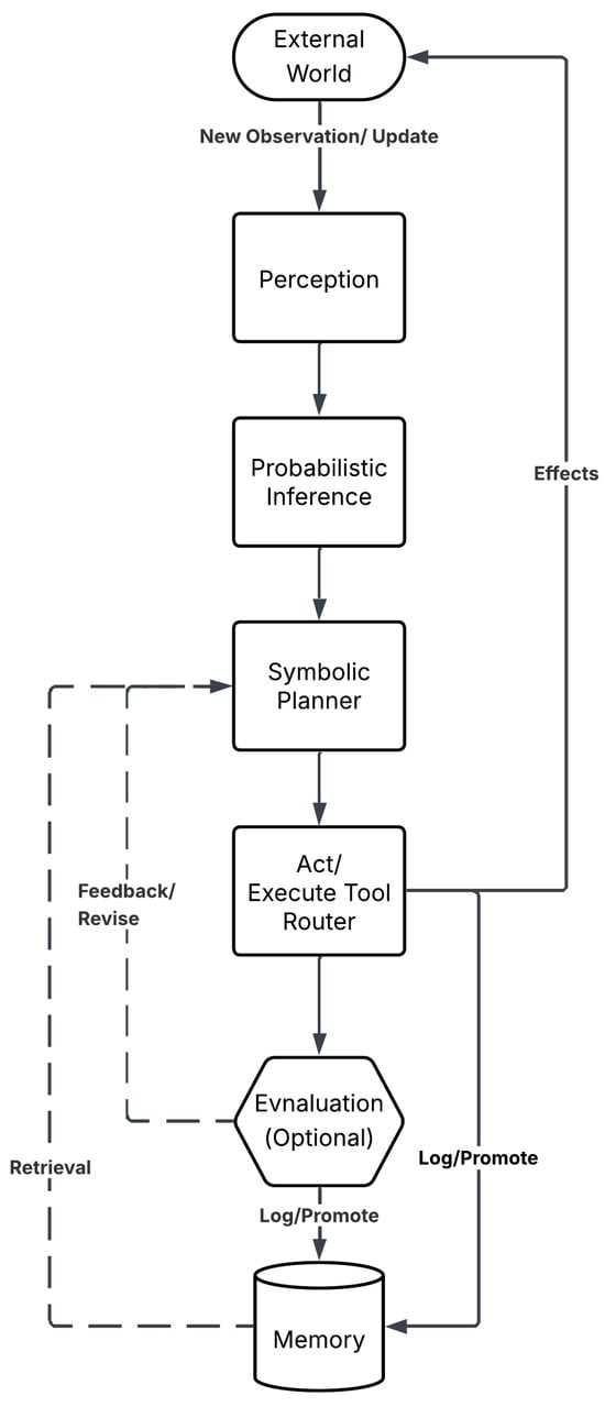 Perception and World Modeling: Perception ingests external inputs (text, events, sensors/APIs) and normalizes them into structured observations. World/state modeling maintains an internal representation used for prediction, consistency checks, and counterfactual simulation. In embodied or data-rich settings, perception is multimodal and frequently layered with probabilistic inference to manage uncertainty before symbolic planning or execution [41,42,95].