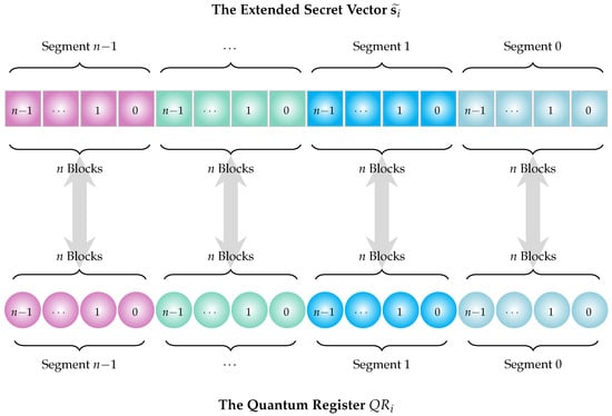 This structured organization is directly reflected in the corresponding quantum registers. Each quantum register is composed of qubits and is similarly partitioned into n segments, each containing qubits. These segments are further divided into n blocks, with each block comprising m qubits. This establishes a one-to-one correspondence between the segments and blocks of the extended secret vectors and those of the quantum registers, ensuring seamless alignment between classical and quantum data representations.