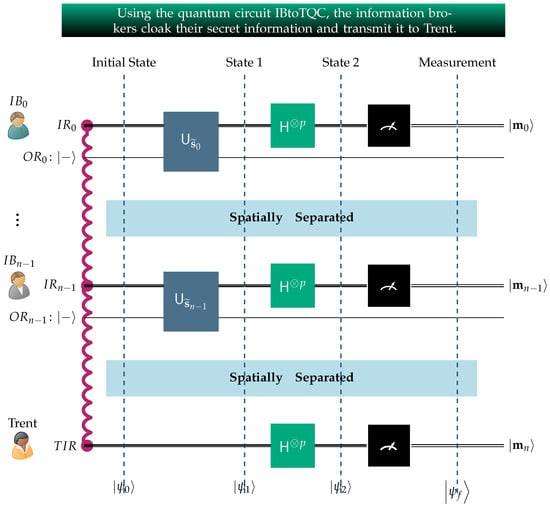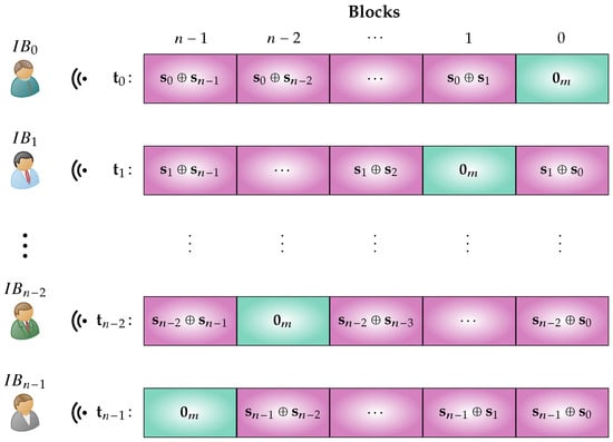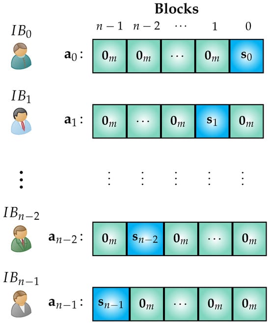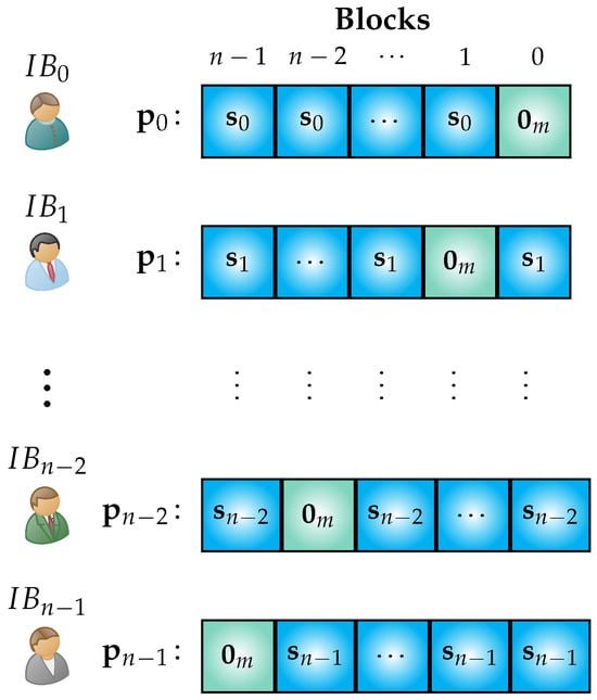 As outlined in Definition 4, each segment consists of n blocks, collectively comprising bits. By leveraging their primary and auxiliary segments, the information brokers can systematically and symmetrically construct their extended secret vectors, , as specified in Definition 5. This structured approach ensures that the information is organized in a manner that supports both the anonymity and parallel many-to-many communication objectives of the QDIBP.