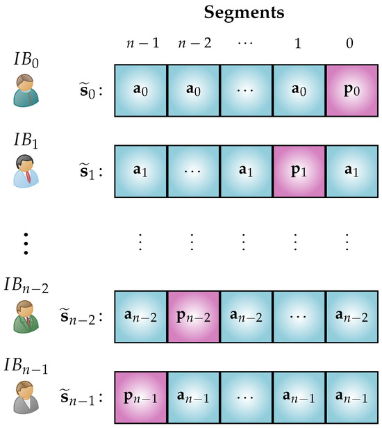 (Primary and auxiliary segments). Each information broker, , , constructs the primary and auxiliary segments, denoted by and , respectively, as illustrated in Figure 2 and Figure 3.