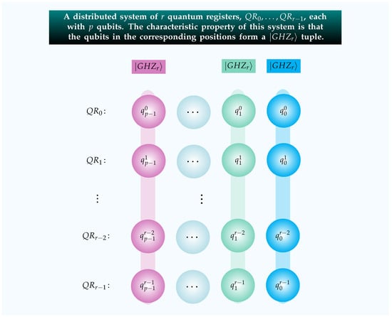 To clearly denote the entanglement of r distinct qubits, we employ the index i, where , to represent the ith qubit, maintaining this convention throughout the paper. Qubits assigned to specific participants, such as Alice, Bob, and others, are denoted as , , and so forth. Modern quantum computers, including IBM’s advanced systems [2,3,4], are capable of preparing states using fundamental quantum operations like Hadamard and CNOT gates. Remarkably, the preparation of these states is highly efficient, requiring only steps [60]. For a deeper exploration of entanglement, readers are directed to comprehensive resources such as [61,62,63]. For the purposes of our proposed protocol, a single tuple is insufficient; instead, we utilize a compound system comprising p such tuples, as described in Equation (2) and further elaborated on in [64]. This configuration enhances the protocol’s capacity to handle complex, distributed quantum communication tasks.