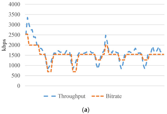 Table 6 illustrates the performance of the algorithms when using dataset 1. Table 6 shows that the proposed ECAAS and ECAA algorithms maintained high bitrate irrespective of the segment duration or buffer size. However, the ECAAS and ECAA algorithms attained a high bitrate at the cost of experiencing a high frequency of bitrate changes. The proposed algorithm aims to balance between achieving high QoE, maintaining fairness among the clients, and high utilization of bandwidth. This resulted in a slightly greater number of bitrate switches when compared to client-side fuzzy-based algorithms (FDASH and FQAA), which solely aim to achieve high QoE. The FDASH and FQAA had a low number of bitrate switches, but they achieved a low average bitrate. Figure 6a,b illustrate the response of the proposed and FDASH algorithms to throughput changes, respectively. Figure 6 depicts that the proposed algorithm maintains consistent video rates during minor variations in the throughput but abruptly adjusts the bitrate when faced with significant fluctuations. On the other hand, the FDASH algorithm maintains consistent bitrate even under large fluctuations. The reason is that the FDASH algorithm considers the average throughput of the last 60 s to adapt the bitrate. Although the algorithm effectively minimizes bitrateS fluctuations, it increases the risk of playback interruptions as well. Moreover, it also exhibits delays in improving video quality as the throughput increases.
