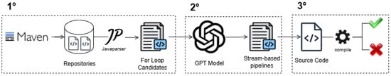 Figure 1 represents the three main steps of our methodology: the first one mines the for-loops candidates from the selected repositories; the second one asks ChatGPT to refactor the identified for-loops into stream-based pipelines; finally, the refactored code is injected in the source code and validated by compiling the application.