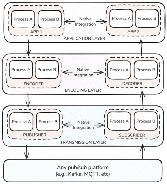 Figure 1 offers a compact overview of this layered design. It highlights three separable layers—transmission (writer/reader) interfacing the broker, encoding/decoding (encoder/decoder) for payload transformation, and the application layer hosting end-user processes—emphasizing native integration within each layer and loose coupling across layers. The following subsections detail each layer and its role in the streaming pipeline.