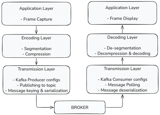 Figure 2 summarizes the end-to-end data path on the producer and consumer sides. It maps frame capture, compression and segmentation, transport to and from the broker, de-segmentation and decoding, and final display, showing how responsibilities are partitioned across the three layers.