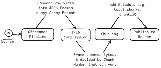 Following compression, each frame is segmented into smaller, manageable chunks. Segmentation is necessary to comply with the pub/sub platform’s (such as Kafka) message size limitations and optimize the system’s capability to handle high-throughput data streams. By dividing large frames into smaller segments, the system mitigates transmission bottlenecks, reduces latency, and achieves a smoother real-time performance even under constrained network conditions.