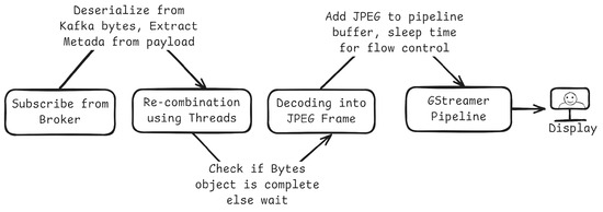 On the consumer side, the application layer employs a complementary GStreamer pipeline dedicated exclusively to displaying video frames to the end user. This consumer-side pipeline runs concurrently on its thread, continuously receiving and processing frames as recombined and decompressed by the encoding/decoding layer. Utilizing a separate thread ensures uninterrupted video display without introducing latency or bottlenecks that could affect other layers’ concurrent decoding or transmission tasks. Consequently, frames are instantly delivered into the visualization pipeline, achieving seamless playback and a responsive user experience.