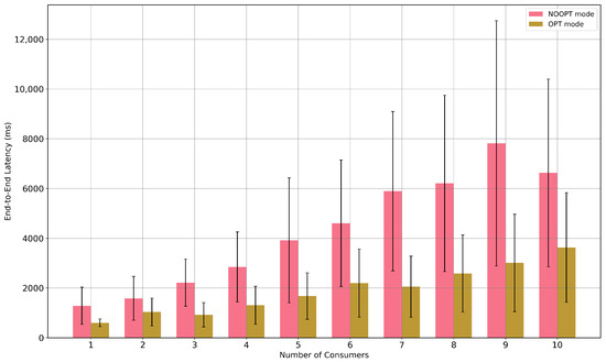 The impact of this optimization is statistically significant () across all consumer loads, as detailed in Figure 12. The benefit is most profound for 2–4 consumers, with latency reductions of 56–68%. While the relative improvement diminishes for 6–8 consumers, the effect remains significant. This demonstrates that our optimization framework substantially extends the operational limits of FrameMQ, thereby mitigating consumer-side bottlenecks and enabling lower latencies even with a higher number of concurrent users. Thus, we conclude that FrameMQ is currently best suited for 1 to 5 concurrent consumers, pending further optimization in design.
