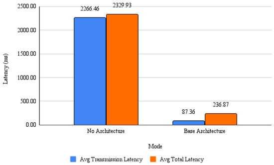 Latency comparison using the same camera across three modes: no architecture, FrameMQ architecture, and FrameMQ with PSO. Lower bars indicate improved responsiveness.