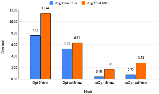 Jitter comparison across modes. Blue bars show average transmission jitter; orange bars show average total jitter. PSO increases short-term jitter due to iterative updates, but values remain within acceptable ranges for stable video while substantially lowering latency.