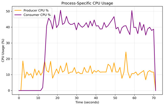 The producer role, capturing and streaming video, proved highly efficient, operating well within its simulated CPU ( avg) and memory (92.2 MB avg) limits. This suggests it is feasible for deployment on standard Pi hardware without modification (Figure 15).