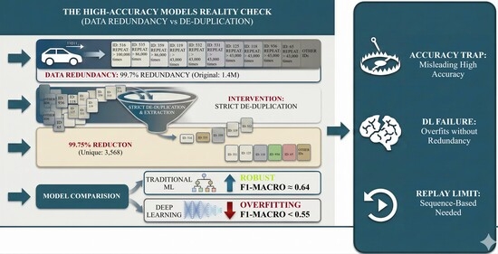 The rapid integration of connectivity and automation in modern vehicles has significantly expanded the attack surface of in-vehicle networks, particularly the Controller Area Network (CAN) bus, which lacks native security mechanisms. This study investigates machine learning-based intrusion detection for Internet of Vehicles (IoV) environments using the CICIoV2024 dataset. Unlike prior studies that rely on highly redundant traffic traces, this work applies strict de-duplication to eliminate repetitive CAN frames, resulting in a dataset of unique attack signatures. To ensure statistical robustness despite the reduced data size, Stratified K-Fold Cross-Validation was employed. Experimental results reveal that while traditional models like Random Forest (optimized with ANOVA feature selection) maintain stability (F1-Macro ≈ 0.64), Deep Learning models fail to generalize (F1-Macro < 0.55) when denied the massive redundancy they typically require. These findings challenge the “near-perfect” detection rates reported in the literature, suggesting that previous benchmarks may reflect data leakage rather than true anomaly detection capabilities. The study concludes that lightweight models offer superior resilience for resource-constrained vehicular environments when evaluated on realistic, non-redundant data. Full article