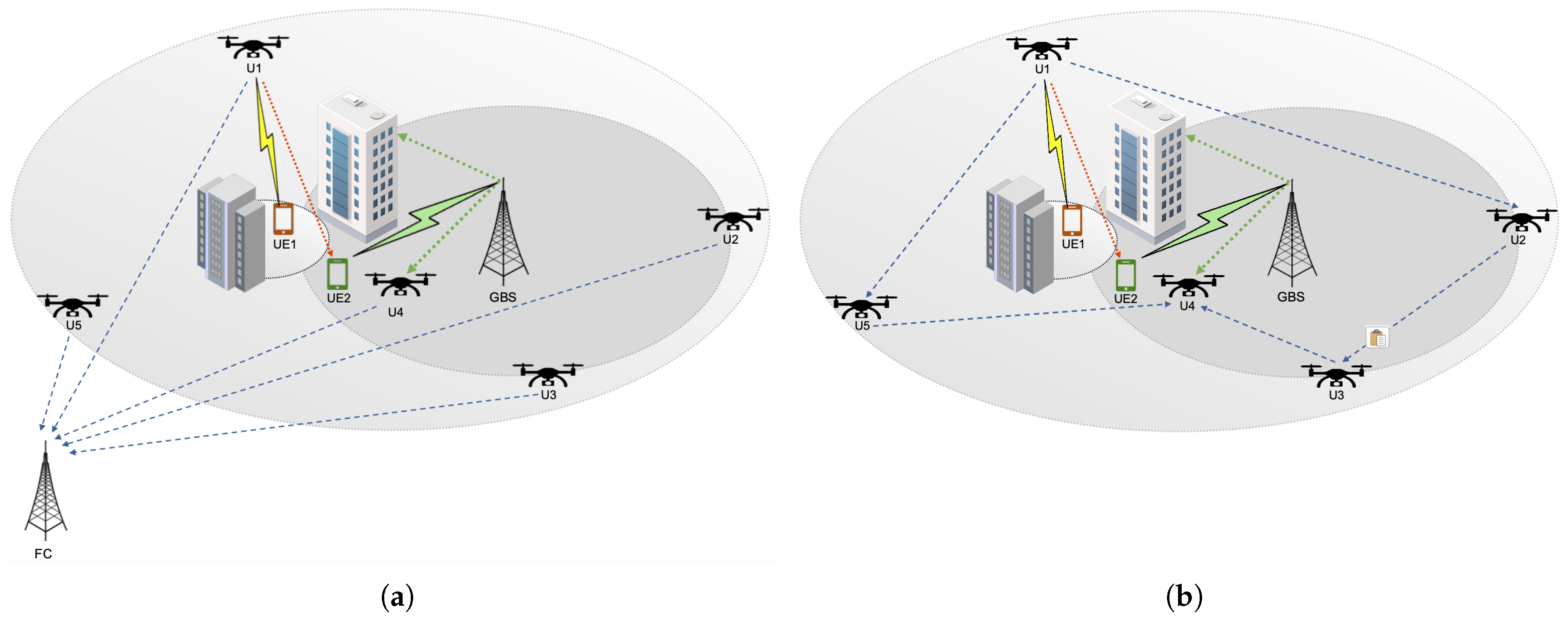 In both cases, we assume the set of K UAVs is randomly deployed within a specific range of distances from the GBS. Moreover, the UAVs operate at the same altitude.