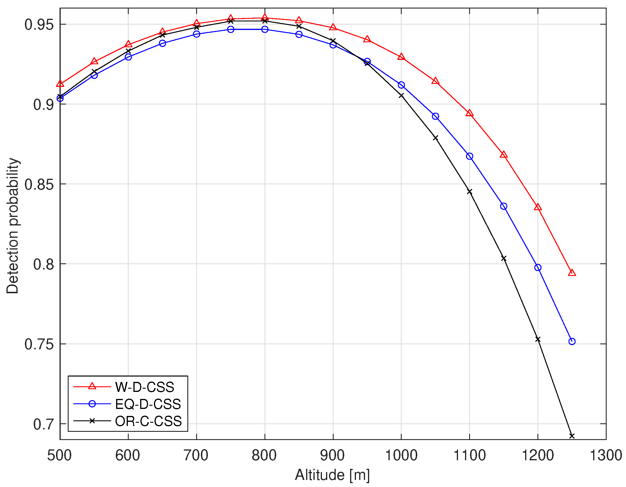 cooperating UAVs, respectively. In both cases, W-D-CSS consistently outperforms EQ-D-CSS and OR-C-CSS across the entire range of