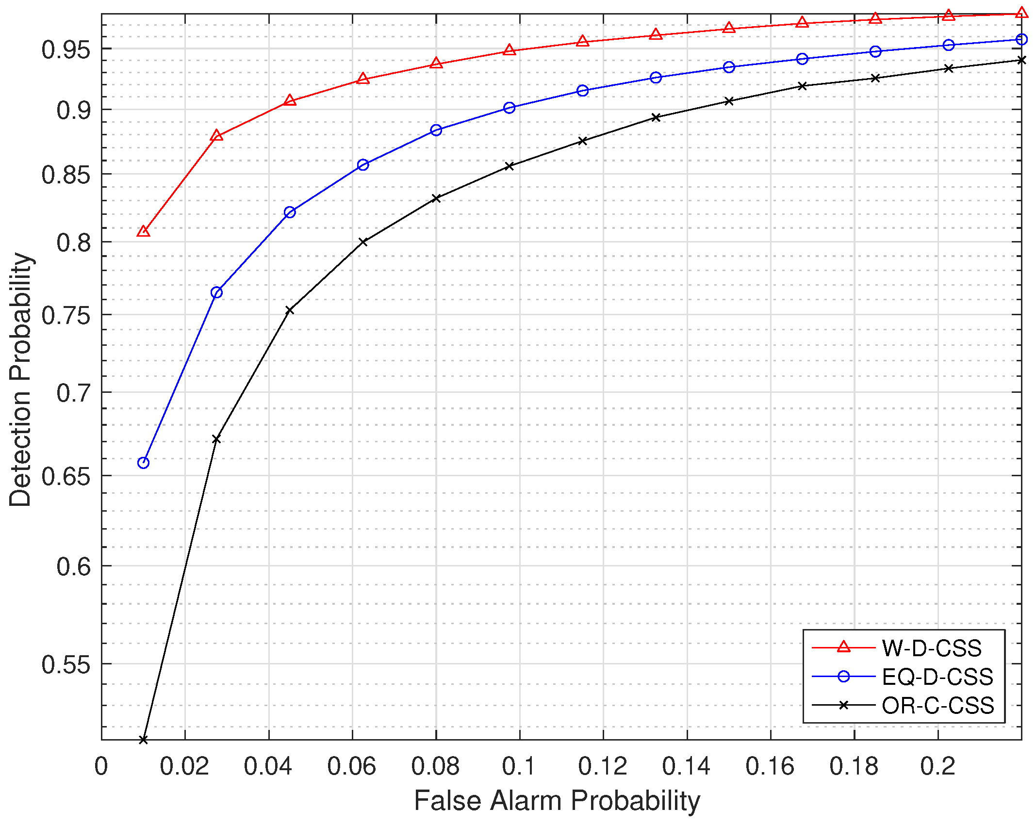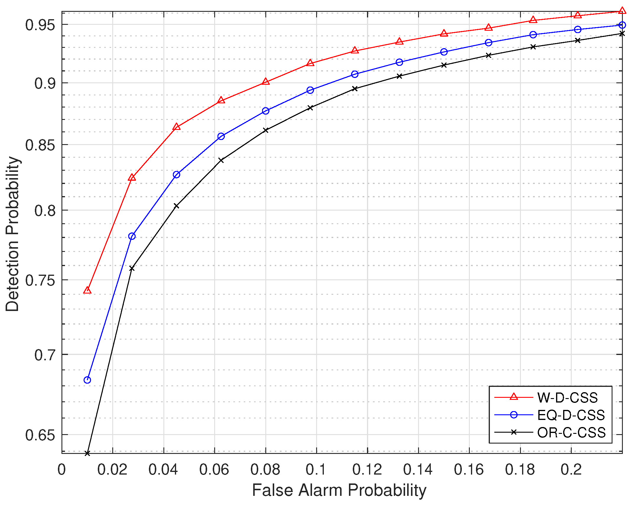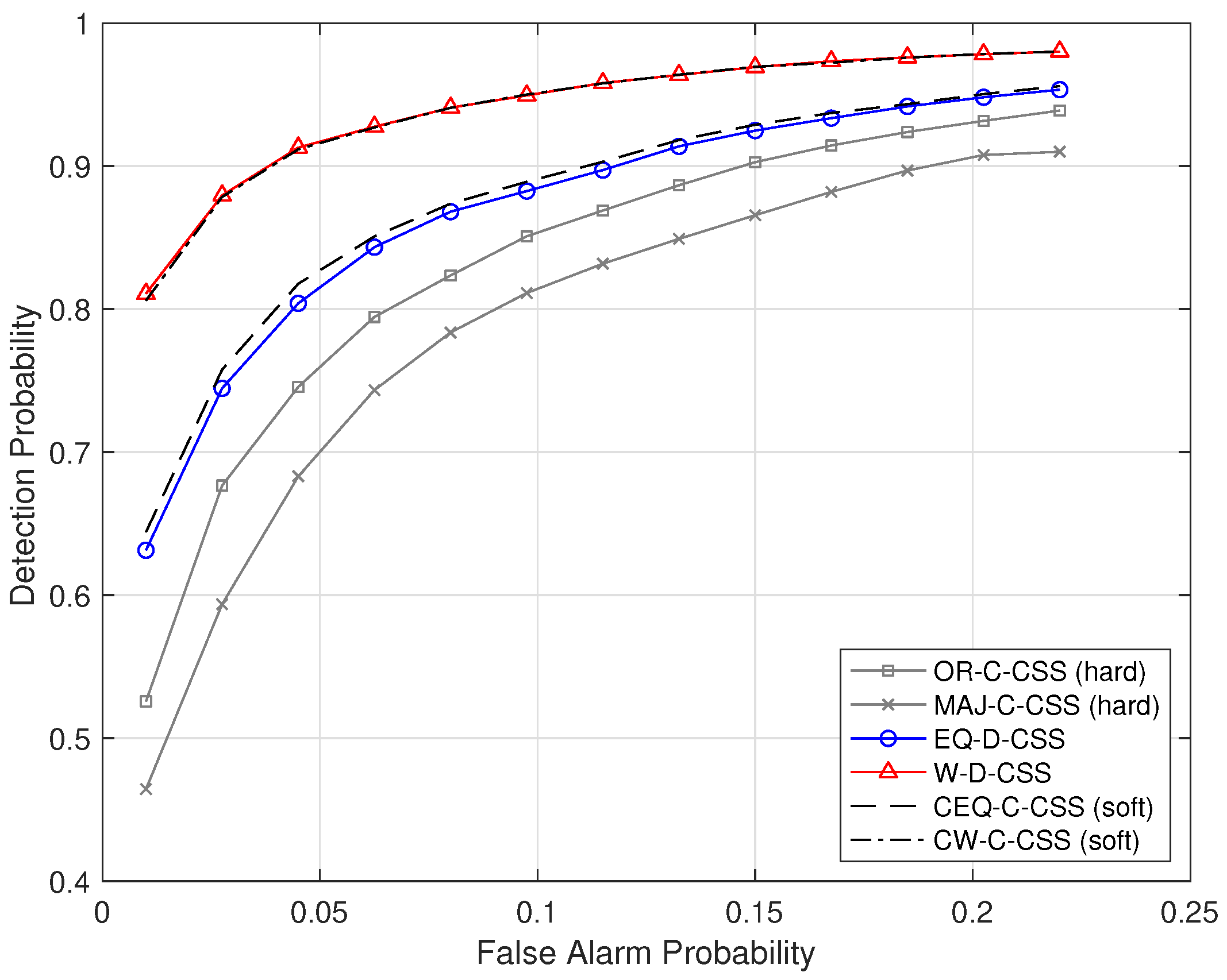 at a given false-alarm level. EQ-D-CSS attains intermediate performance, whereas the centralized OR-C-CSS scheme yields the lowest detection probability.