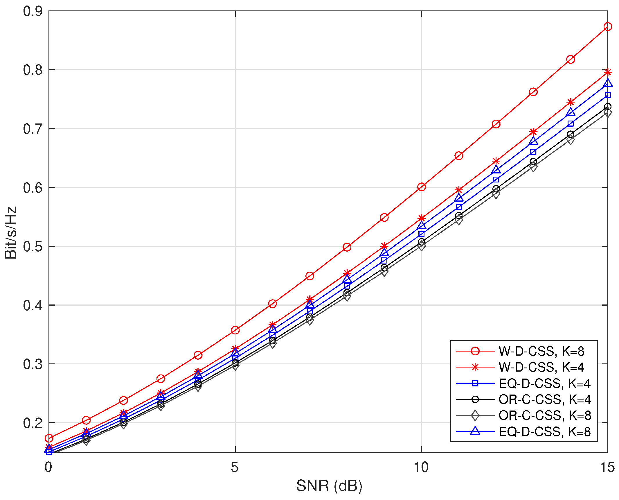Figure 12 plots the normalized capacity (bits/s/Hz) versus the received SNR for the three schemes of CSS for