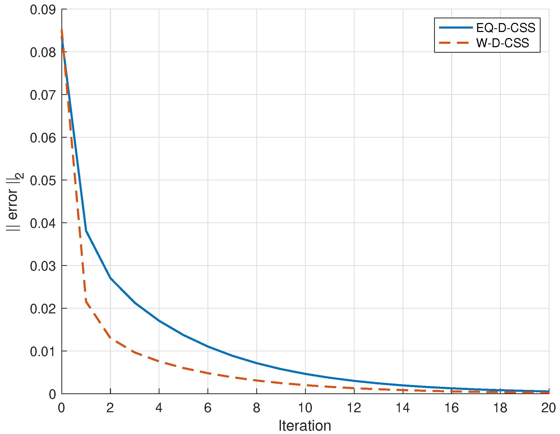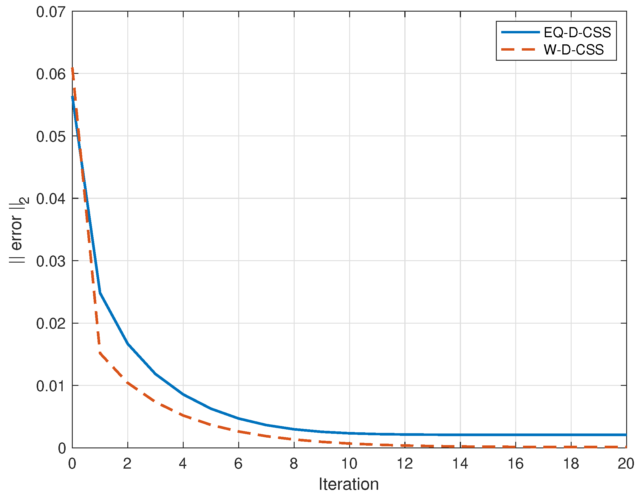 , comparing EQ-D-CSS and W-D-CSS. Both schemes converge within a few iterations; however, W-D-CSS exhibits a faster decrease of the error norm, confirming the benefit of weighting the UAVs’ local ST values according to the inverse of their variances.