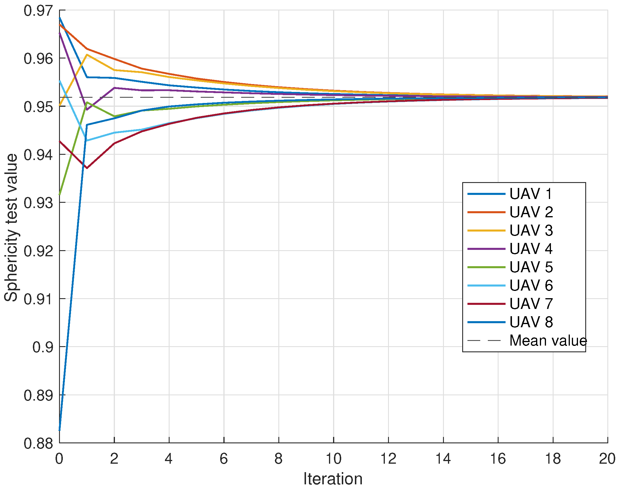 Finally, to provide further insight into performance, we evaluate the convergence behavior of both distributed schemes as a function of the number of iterations required to achieve consensus among the UAVs.