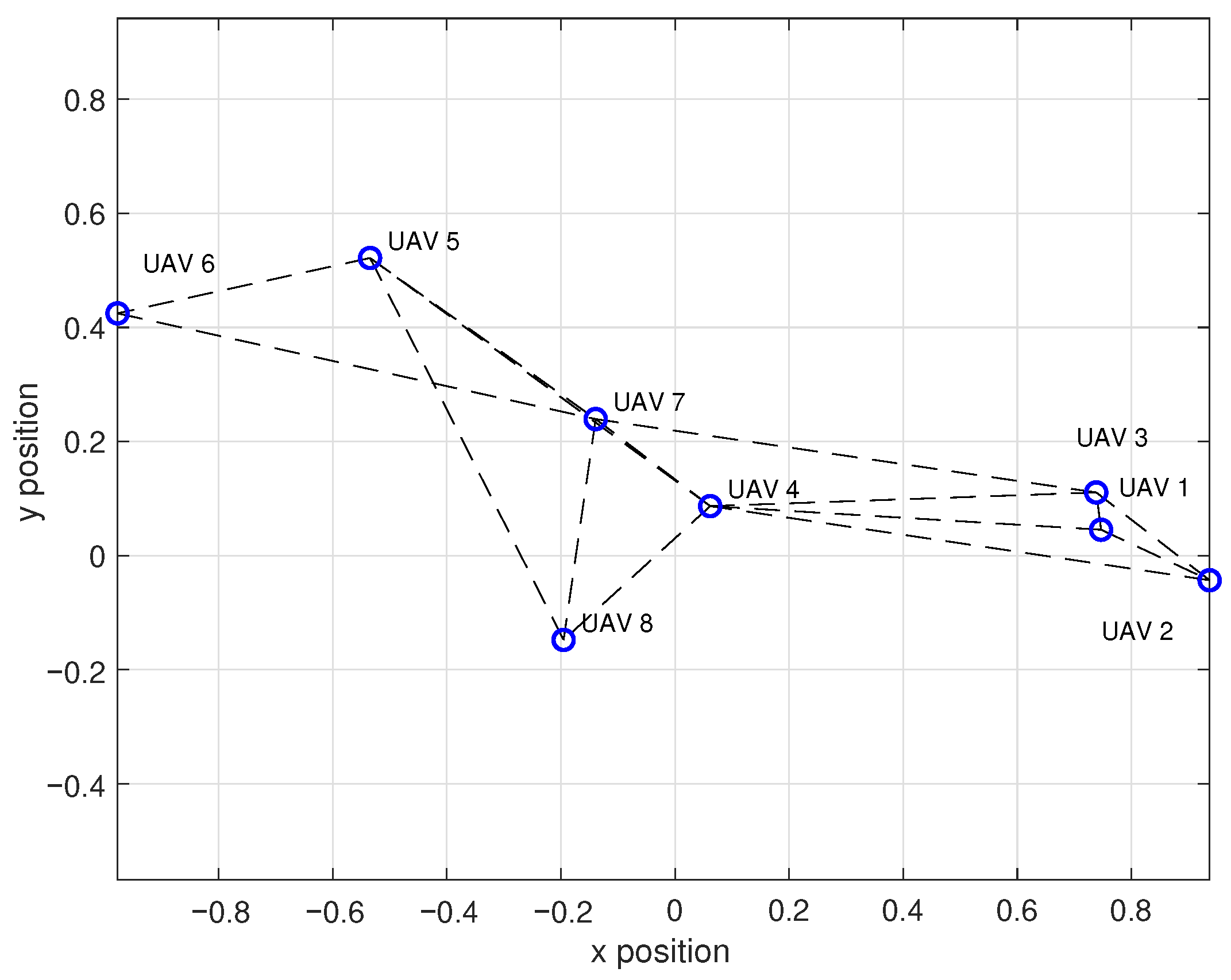Figure 1b, is adopted in this paper. In this configuration, the UAVs are represented as the vertices of a connected communication graph, whose edges correspond to LoS links established according to proximity.