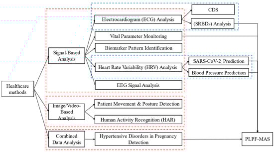 IoT devices and sensors collect various data from different events and conditions, including temporal and geographical data. These tools are becoming smarter and are quickly able to communicate and perform complex tasks [8]. The IoT continuously collects data through diffuse devices worldwide [9] and contributes to different fields, such as healthcare, disaster management, and learning [10]. The use of artificial intelligence (AI) to improve healthcare is a major challenge due to advances and new research in medicine [11]. Consequently, the software and infrastructure of healthcare that are supported by IoT must be developable to accommodate the latest updates in the field [12]. Data analysis and decision-making based on IoT are important issues in the healthcare system, in addition to monitoring vital signs to predict the patient’s future state [13]. Indeed, patient lives could be at risk, especially people who live alone, so monitoring data and vital signs is very important [14,15,16]. However, the development of healthcare applications and software is a major challenge for developers due to the important, sensitive, and varied information related to patients, diseases, and treatment. However, medical applications and software based on IoT must be extremely accurate to analyze data and provide treatment, with legal approval from medical expert committees [17,18].