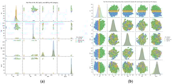 (a) Pair plots for HR, RR, ABP, and SpO2 by HR category. (b) Pair plots for heart rates, respiratory rates, systolic BP, diastolic BP, and oxygen saturation by HR category.