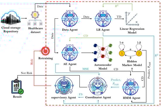 - Linear Regression Agent (LR agent): This is also called a reliability agent. It evaluates the linear relationship quality between the data and the risk-flag. The actions of this agent are divided into several steps, initially taking the data and risk-flag and dividing the data into training and testing sets to avoid bias. Then, it trains the LR model on the training data and ensures that the training process occurs in parallel with AE-HMM model training, followed by the measurement and verification phase. It does so to predict bias in the training model and to calculate the value by comparing it with the threshold value, as in [38]. This is followed by the communication phase, where the agents connect with the coordinator agent. The LR agent interacts with the coordinator agent to obtain recommendations and warnings depending on the value. It also interacts with the supervisory agent to retrain the model (LR) again if the value decreases. Therefore, the LR agent is important in making the final decision by declining weak evidence, thus decreasing the value. When the value is compatible with the HMM, the warnings are more reliable.