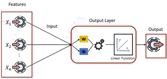 - Autoencoder Model (AE): This is an unsupervised deep learning technique widely used in data analysis and processing. It is trained to reconstruct the input data, which helps extract important and hidden features. The simple autoencoder goes through several stages: encoding in Equation (4), which teaches it to compress the input; bottlenecking, which stores the encoded representation of the input; and decoding in Equation (5), which teaches it to reconstruct the output from the bottleneck, as shown in Figure 6. Reconstruction loss measures the error between the input and output (Equation (6)).
