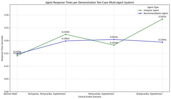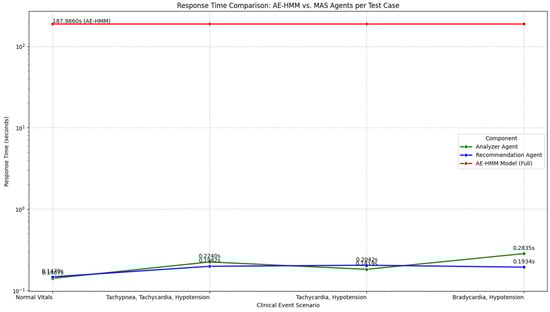 Figure 9 shows the response times of AE-HMM and the MAS when dealing with clinical states. The figure indicates that for clinical states and recommendations, the MAS is highly efficient and responsive. This makes it suitable for real-time clinical decision support systems.