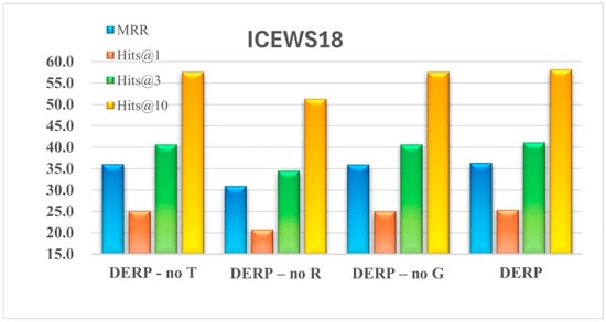 To investigate the impact of entity embedding dynamics over time, the adaptive relation adjustment mechanism, and the RAGAT encoder incorporating dynamic relation weights on the DERP model, this paper compares different DERP variants based on four metrics: MRR and Hit@1, Hit@3, Hit@10. The variant DERP-no T removes features related to the temporal variation in entity embeddings—specifically, the long-term and short-term temporal embeddings as well as the positional time encodings—retaining only static entity features. DERP-no R replaces the adaptive relation adjustment mechanism with a fixed, uniform relation-weighting scheme, thereby eliminating dynamic relation weighting. DERP-no G removes the RAGAT encoder. Table 4 presents the results of variant models on the ICEWS14 and ICEWS18 datasets. As visually demonstrated in Figure 3 and Figure 4, the full DERP model significantly outperforms the DERP-no T, DERP-no R, and DERP-no G variants across all metrics, validating that its integration of temporally evolving entity embeddings, an adaptive relationship adjustment mechanism, and RAGAT enhances entity prediction capabilities.