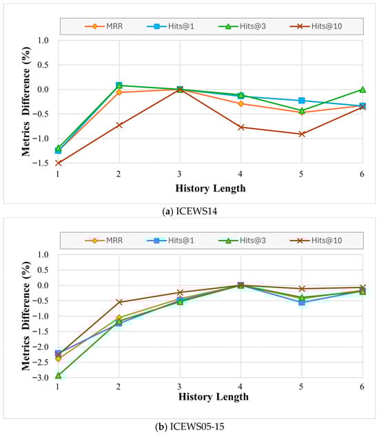 Experiments were carried out on datasets with varying historical lengths to investigate the impact of historical length on various datasets. The default value of the history length is 3. Figure 5 displays the percentage change in MRR across historical lengths from 1 to 6. Two primary observations are noted: (1) The MRR increases with historical length for the ICEWS18 and GDELT datasets. Performance can be considerably improved by extending the historical length for shorter lengths. However, for GDELT, the impact diminishes as the length increases, and improvements become marginal beyond a length of 3. Considering both performance and computational cost, the history length was set to 6 for ICEWS18 and 3 for GDELT. (2) Figure 5 illustrates that the ICEWS14 dataset performs best when the historical length is 3. On the other hand, performance declines as historical length increases. This indicates that incorporating longer history of this dataset, irrelevant information rather than beneficial signals, thereby degrading performance. The ICEWS05-15 dataset, except for its ideal historical length of 4, exhibits similar trends.