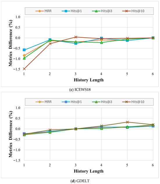 Results on Public KGs: For ICEWS14 and GDELT, the history length was set to 3; for ICEWS05-15, it was set to 4; and for ICEWS18, it was set to 6. The impact of history length is discussed in Section 4.5. Table 2 and Table 3 present the performance comparisons of all the baseline models. The DERP model outperforms the other baseline models in terms of MRR and Hit@N metrics across all datasets, demonstrating its superior prediction accuracy. As shown in Table 1. Detailed statistics of the dataset, our DERP achieves the smallest MRR improvement of 2.53% on the ICEWS18 dataset and the largest MRR improvement of 7.55% on the ICEWS05-15 dataset. This is because the ICEWS18 dataset is highly dense: models can already learn many facts through pre-training, resulting in a relatively high baseline MRR. Consequently, the improvement margin brought by DERP is compressed, leading to a smaller performance gain. While ICEWS05-15 contains a large total number of facts, it has the lowest average number of facts per snapshot (32.2), indicating that individual snapshots are sparser. This suggests that our model can effectively learn from TKGs with limited information per timestamp, demonstrating its robustness in sparse temporal settings.