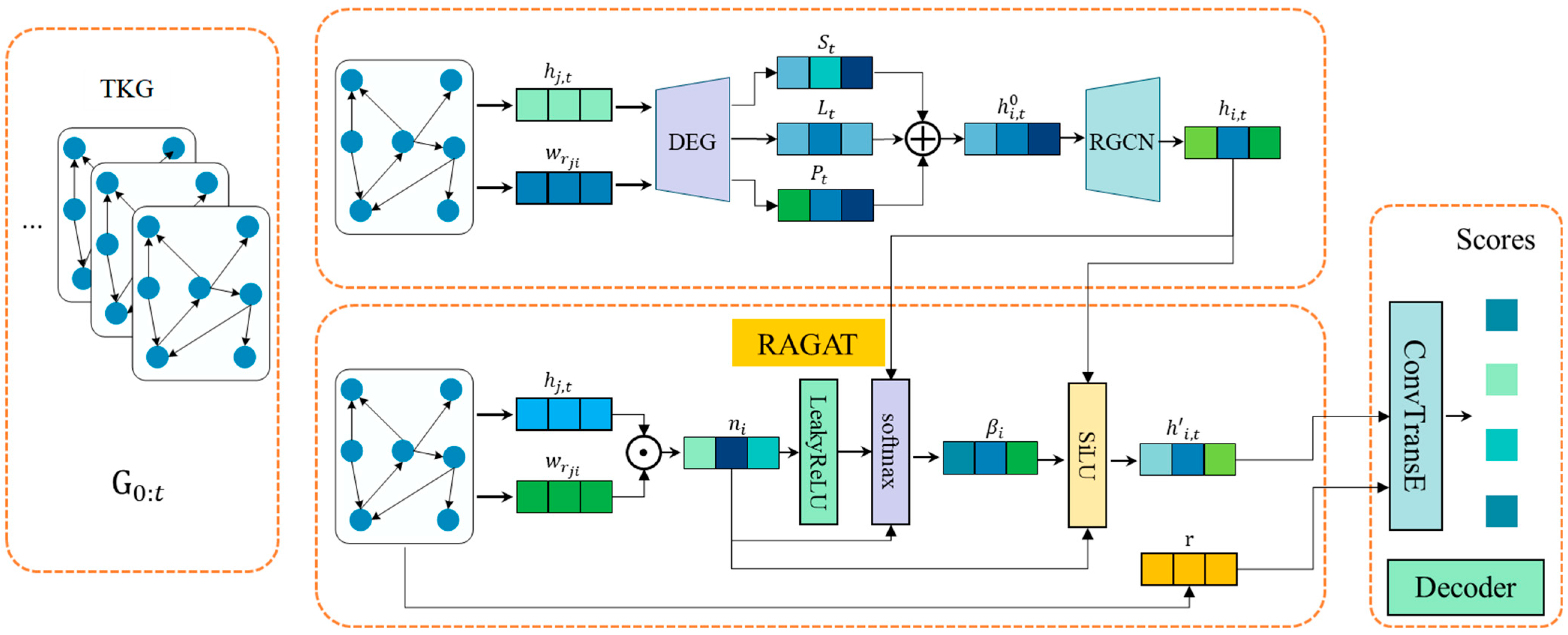 - RE-GCN [25] captures factual and temporal dependencies in temporal knowledge graphs through a relation-aware graph convolutional network combined with a recursive modeling mechanism, exhibiting strong joint modeling capabilities.