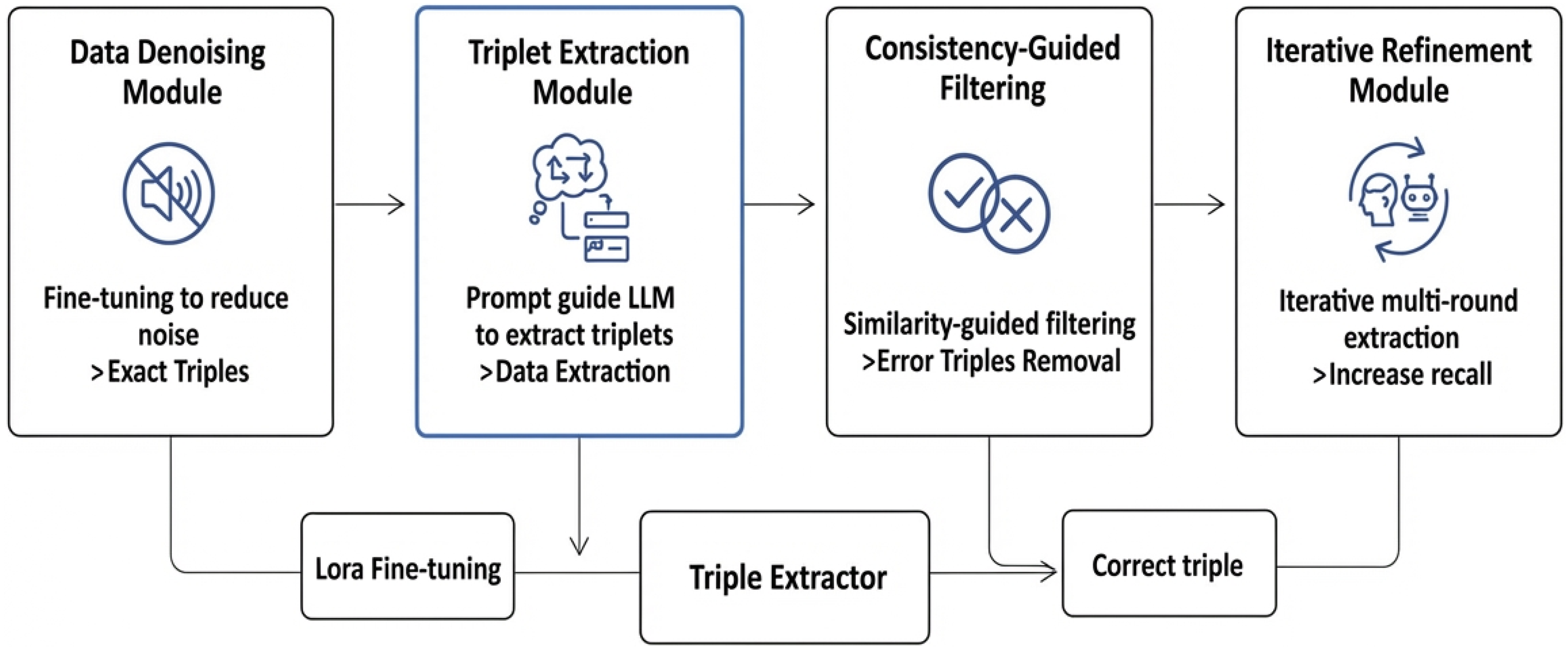 We propose a consistency-guided filtering module that verifies candidate triples against the source text and removes hallucinated or unsupported extractions, thereby improving the precision and reducing noise.