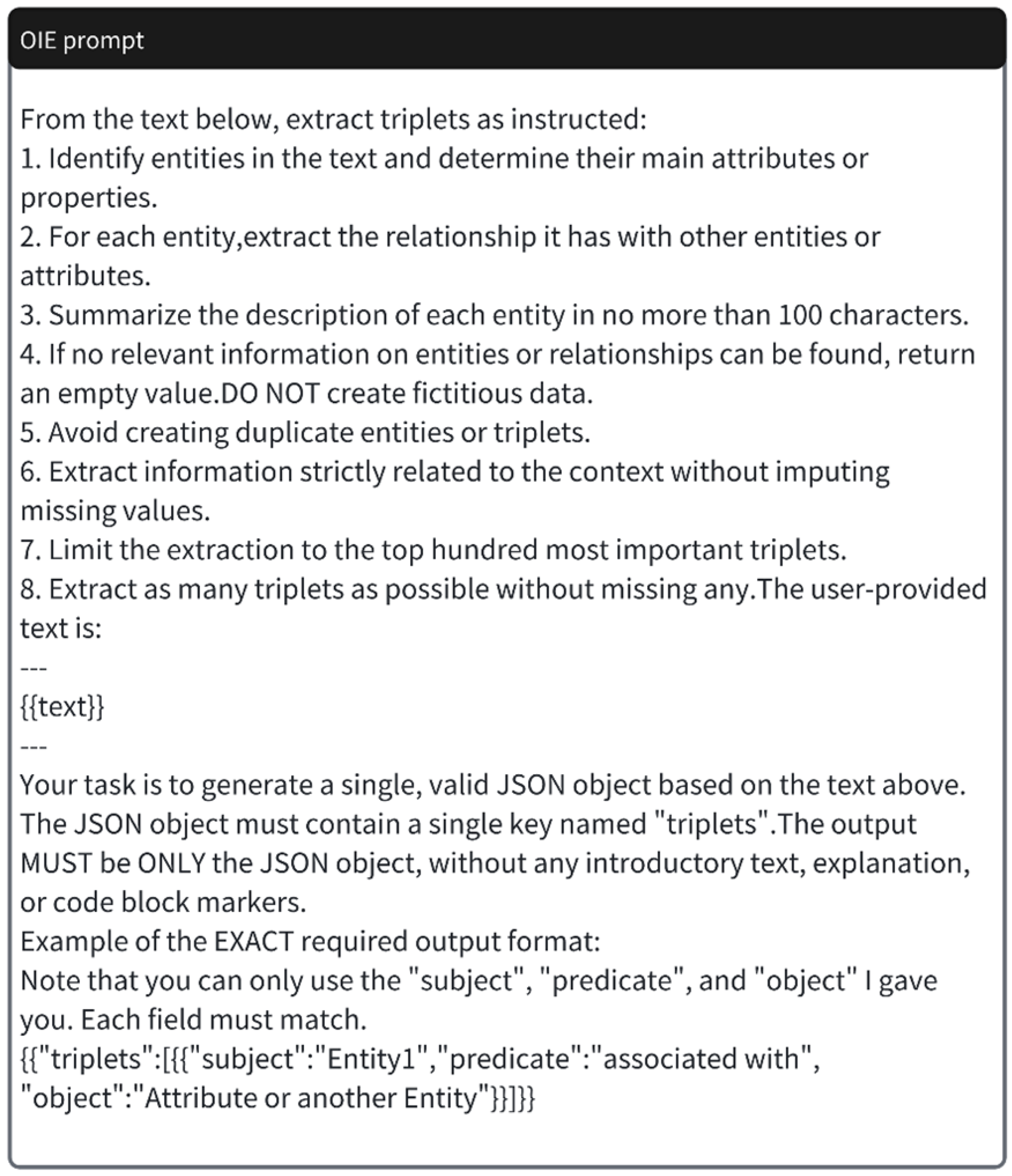 Figure 5, we design a structured instruction prompt for LLM-based open information extraction. The prompt guides the model to identify entities and their main attributes, extract relations between entities, avoid duplicate or hallucinated triplets, and restrict the output to at most one hundred informative triplets. The model is further required to return a single valid JSON object with a single key
