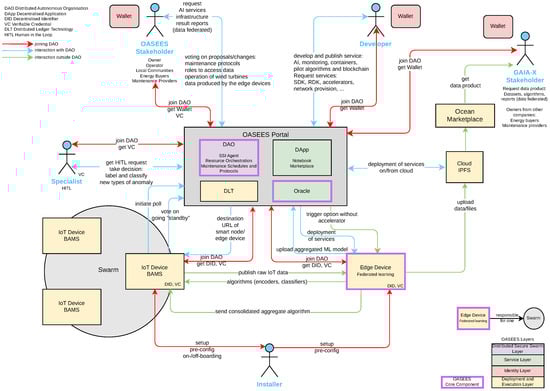 Swarm collaboration within OASEES is a robust process that brings together a collective of edge devices and human experts. It leverages decentralized technology for involvement, synchronization, and oversight. A significant aspect of this process is the execution of collaboration within the Gaia-X (Gaia-X: Federated Secure Data Infrastructure; https://gaia-x.eu/ (accessed on 4 January 2026)) data federation, which enhances data sharing, interoperability, and sovereign data services. It enables federated learning by coupling DAO with Human-in-the-Loop (HITL) mechanisms across disparate edge devices.